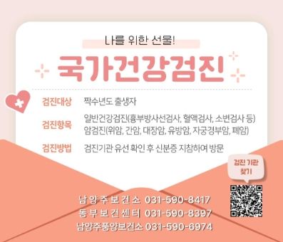 정태식 남양주보건소장은 “건강검진은 주기적인 건강관리에 매우 필수적이며, 매년 연말에는 검진 예약이 많이 몰려 예약이 어렵기 때문에 조금이라도 빨리 검진을 받으시길 당부드린다”라고 전했다.