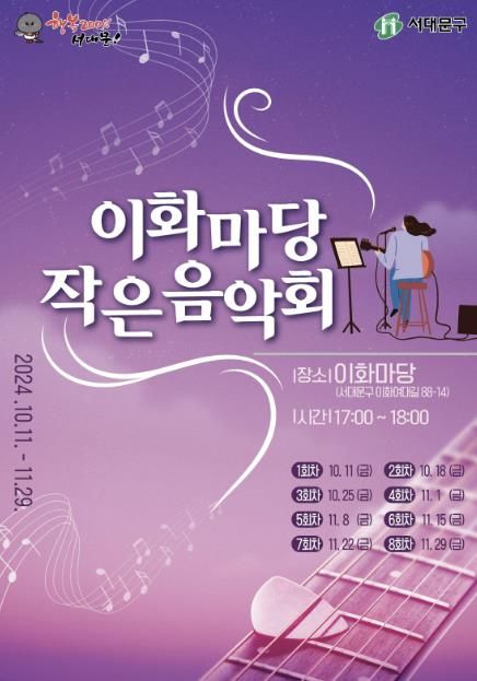 경기호연뉴스 민선기 기자 | 서대문구가 10월 11일부터 11월 29일까지 매주 금요일 오후 5∼6시 이화마당(이화여대길 88-14)에서 총 8회에 걸쳐 ‘작은 음악회’를 개최한다.
