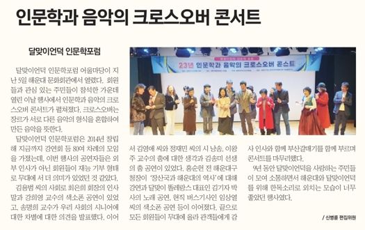경기호연뉴스 민선기 기자 | 달맞이언덕을 중심으로 활동하고 있는 인문학자와 예술가들의 모임인 '달맞이언덕인문학포럼'은 2024년 10월 28일 17-19시에 해운대문화회관 고운홀에서 '2024 인문학과 예술의 크로스오버 콘서트'를 개최한다.