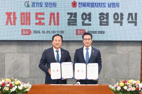 경기호연뉴스 민선기 기자 | 경기도 오산시와 전북특별자치도 남원시가 23일 오전 오산시청 상황실에서 자매결연 협약식을 맺고 상생발전 및 공동발전 협력 강화에 나서기로 했다.