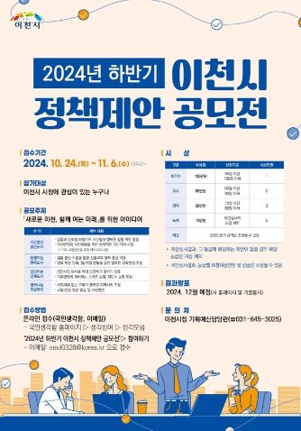 시 관계자는 “이번 '2024년 하반기 이천시 정책 제안공모전'을 통하여 시민들의 다양하고 창의적인 제안을 발굴하여 시정에 적극 반영함으로써 행정서비스의 질을 높이고 시민과 함께 소통하는 열린 행정이 실현되도록 노력하겠다”라고 말했다.