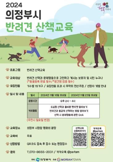 경기호연뉴스 민선기 기자 | 의정부시는 11월 16일과 23일 시청 앞 평화의 광장에서반려견 가족과 함께 하는 ‘반려견 산책 교육’을 실시한다.