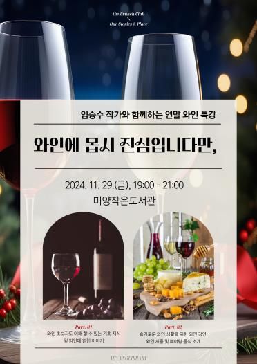경기호연뉴스 민선기 기자 | 안성시 미양작은도서관은 오는 11월 29일 금요일 오후 7시, 임승수 작가와 함께하는 연말 와인 특강 '와인에 몹시 진심입니다만,'을 진행한다.