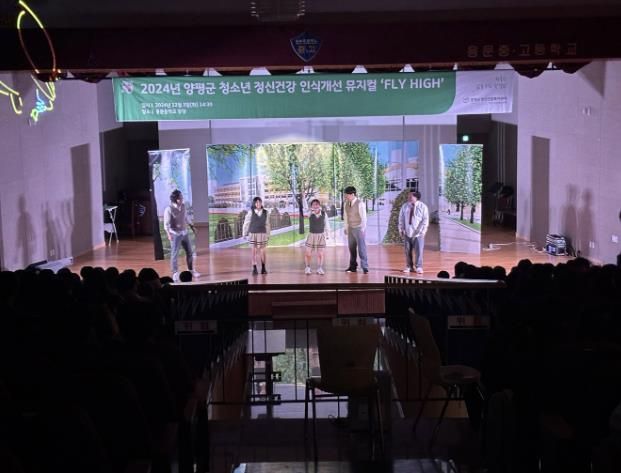 경기호연뉴스 민선기 기자 | 양평군은 용문중학교 학생들을 대상으로 정신건강 인식개선 및 학교폭력 예방을 위해 3일 용문중학교 강당에서 청소년 정신건강 인식개선 뮤지컬 ‘FLY HIGH’ 공연을 선보였다.