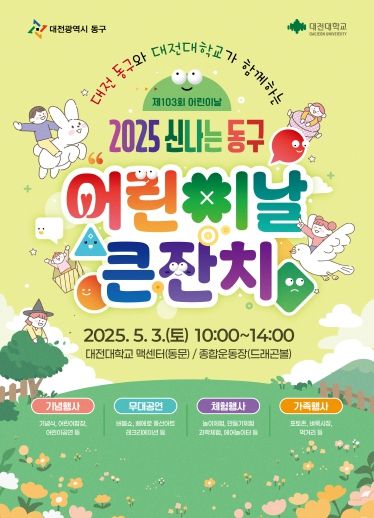 경기호연뉴스 민선기 기자 | 대전 동구는 제103회 어린이날을 맞아 5월 3일 오전 10시 대전대학교 맥센터 실내체육관에서 ‘2025 신나는 동구 어린이날 큰잔치’를 개최한다고 30일 밝혔다.