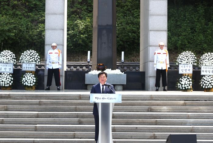 이날 행사는 국민의례를 시작으로, 오전 10시 전국에 울린 사이렌에 맞춰 묵념하고 헌화 및 분향, 추념사, 현충일 노래 제창 등 엄숙한 분위기 속에 진행됐다. 참석자들은 경건한 마음으로 순국선열과 호국영령들의 고귀한 뜻을 되새기며, 나라 사랑의 의지를 다졌다.