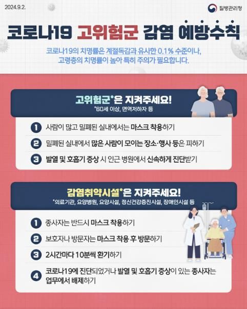 특히, 코로나19 입원환자 중 65세 이상 고령층의 비중이 가장 높아 고위험군은 사람이 많은 밀폐된 실내 행사 참여를 자제해야 한다. 불가피하게 참여하는 경우 마스크를 반드시 착용하고 발열이나 호흡기 증상이 있을 때는 신속하게 진료를 받아야 한다.
