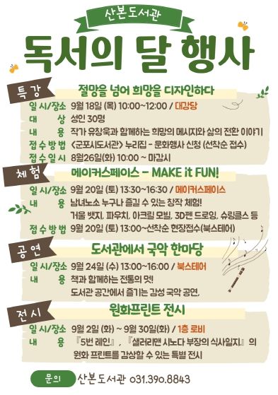 경기호연뉴스 민선기 기자 | 군포시 산본도서관이 9월 ‘독서의 달’을 맞아 시민 누구나 책과 함께 즐길 수 있는 다양한 독서문화프로그램을 준비했다. 이번 행사는 특강, 체험, 공연, 전시 등 남녀노소 전 세대가 즐길 수 있는 다양한 프로그램들로 구성됐다.