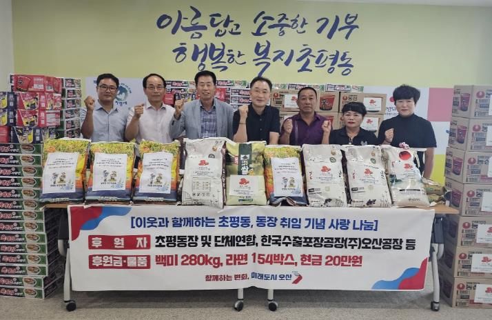 경기호연뉴스 민선기 기자 | 오산시 초평동은 지난 15일, 초평동장과 초평동 단체 연합, 한국수출포장공장(주) 오산공장, 지역 주민들이 함께 백미 280kg, 라면 154박스, 현금 20만 원을 기탁했다고 밝혔다.