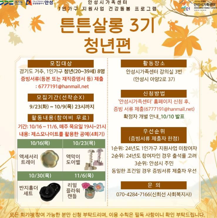 경기호연뉴스 민선기 기자 | 안성시가족센터는 1인 가구 청년층을 대상으로 ‘건강돌봄 프로그램 – 튼튼살롱 3기’ 참여자를 모집한다.