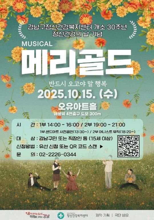 경기호연뉴스 민선기 기자 | 꿈이 모이는 도시, 미래를 그리는 강남구가 정신건강복지센터 개소 30주년과 세계정신건강의 날(10월 10일)을 기념해, 오는 10월 15일 오후 2시와 7시, 오유아트홀(남부순환로378길 34-9)에서 구민과 함께하는 특별 뮤지컬 ‘메리골드 – 반드시 오고야 말 행복’을 개최한다.
