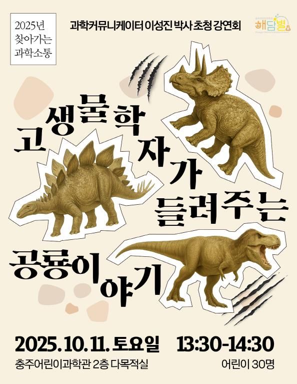 경기호연뉴스 민선기 기자 | 충주어린이과학관은 오는 10월 11일, 과학커뮤니케이터로 활동 중인 고생물학자 이성진 박사를 초청해 초등 저학년 어린이를 위한 특별 강연 ‘고생물학자가 들려주는 공룡 이야기’를 개최한다고 밝혔다.