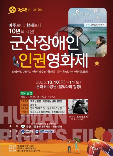 경기호연뉴스 민선기 기자 | 군산시 장애인가족지원인권센터가 10월 10일부터 11일까지 은파호수공원 물빛다리 광장에서 군산시민을 대상으로 장애인 인식개선 및 인권의식 함양을 위한 2025년 제10회 군산장애인인권영화제를 개최한다.