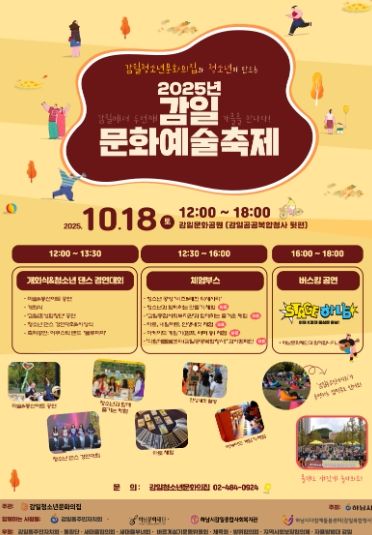 경기호연뉴스 민선기 기자 | 하남시 감일청소년문화의집은 오는 10월 18일 오후 12시부터 18시까지 감일문화공원(감일공공복합청사 뒷편)에서 '제2회 감일문화예술축제'를 개최한다.