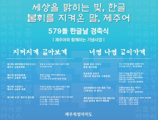 경기호연뉴스 민선기 기자 | 제주특별자치도는 훈민정음 반포 579돌 한글날을 맞이해 오는 9일 오전 10시 제주문예회관에서 한글날 경축식을 개최한다.