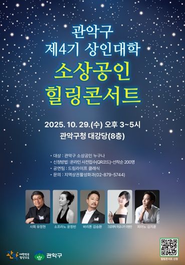 경기호연뉴스 민선기 기자 | 관악구는 오는 10월 29일 오후 3시, 구청 8층 대강당에서 관내 소상공인을 위한 힐링콘서트를 개최한다.