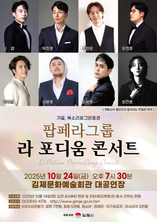 경기호연뉴스 민선기 기자 | 깊어 가는 가을, 특별한 음악의 향연 팝페라 그룹'라 포디움 콘서트'가 오는 24일 오후 7시 30분 김제문화예술회관 대공연장에서 펼쳐진다.