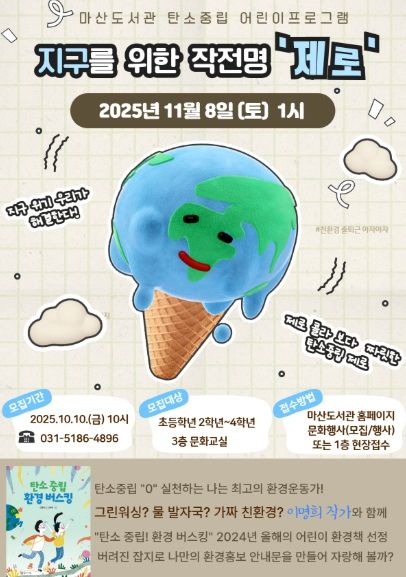 경기호연뉴스 민선기 기자 | 김포시 마산도서관에서 오는 11월 8일 오후 1시부터 3시까지, 초등학교 2학년~4학년 어린이를 대상으로 탄소중립 어린이 프로그램 책풍당당 '지구를 위한 작전명 ‘제로’'를 운영한다.