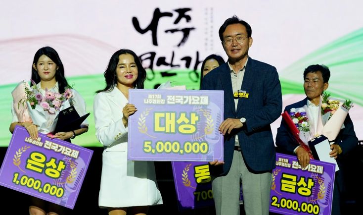 경기호연뉴스 민선기 기자 | ‘2025 나주영산강축제’ 국민참여 프로그램중 하나인 ‘제17회 나주 영산강 전국 가요제’에서 천년학(김용림)을 열창한 장성희 씨(광주광역시)가 영예의 대상을 차지해 부상으로 상금 500만 원을 수여 받았다.