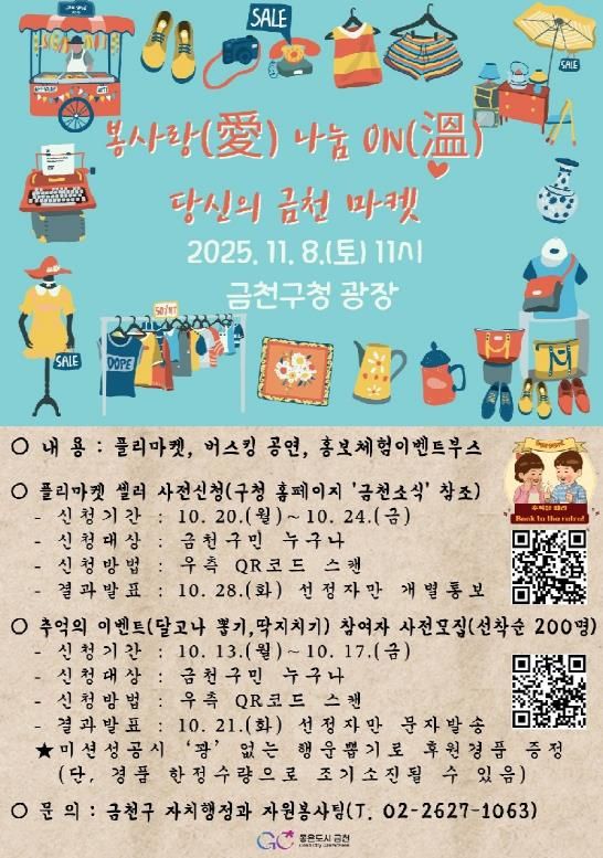 경기호연뉴스 민선기 기자 | 금천구는 오는 11월 8일 금천구청 광장 앞에서 ‘봉사랑(愛) 나눔ON(溫), 당신의 금천마켓’을 연다고 밝혔다.
