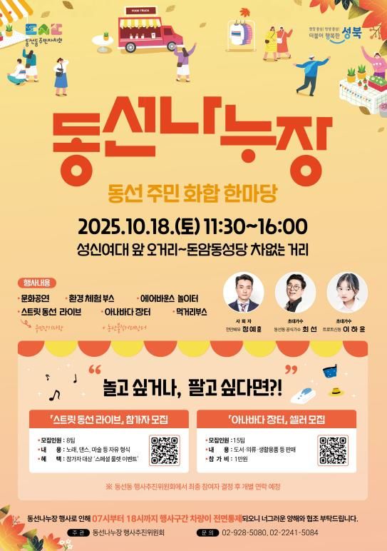 경기호연뉴스 민선기 기자 | 서울 성북구가 오는 10월 18일 오전 11시 30분부터 오후 4시까지 성신여대 앞 오거리에서 돈암동성당 구간까지 이어지는 도로에서 ‘2025년 차 없는 거리 동선나누장’을 개최한다.