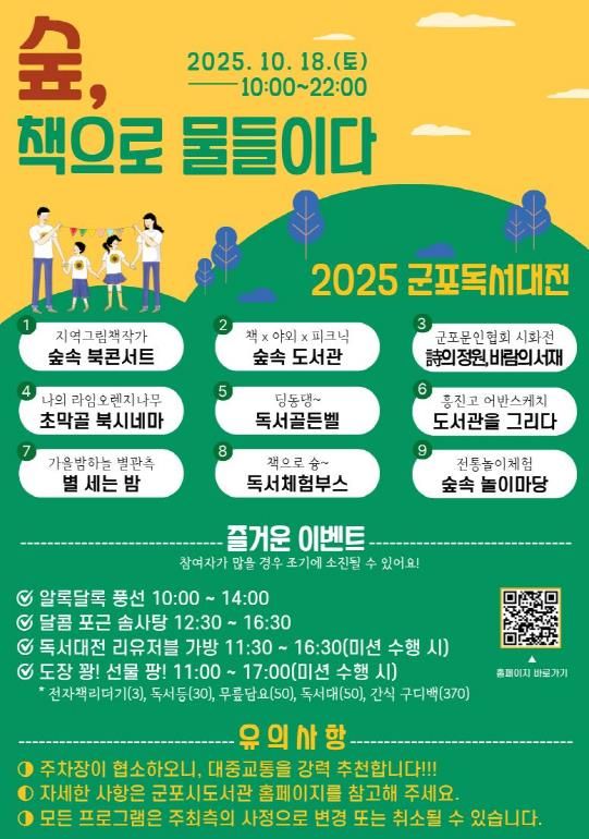 올해 독서대전은 군포올래 행복축제와 통합 개최되어 ‘책과 자연이 어우러진 감성적인 독서축제’로 펼쳐지며 시민 누구나 함께 즐길 수 있는 체험·전시·공연형 프로그램으로 구성된다.