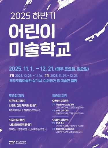 경기호연뉴스 민선기 기자 | 제주특별자치도 도립미술관(관장 이종후)은 10월 25일부터 12월 21일까지 ‘2025 어린이 미술학교’ 하반기 교육프로그램을 운영한다.