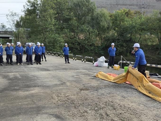 참여자들은 방재 훈련 프로그램에 따라 ▲사고 상황 보고 및 초동 대응 ▲고장 설비 정지 및 수계 유입 차단 ▲기름 차단막(오일펜스) 설치 및 흡착포를 활용한 유류 제거 ▲오염 확산 여부 조사와 시료 채취 등 단계별 절차를 체계적으로 실습했다.