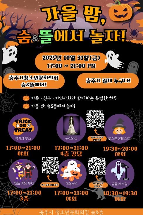경기호연뉴스 민선기 기자 | 충주시청소년문화의집 숨·뜰에서는 10월 31일 오후 5시부터 9시까지 ‘가을밤, 숨뜰에서 놀자!’ 행사를 진행한다고 밝혔다.