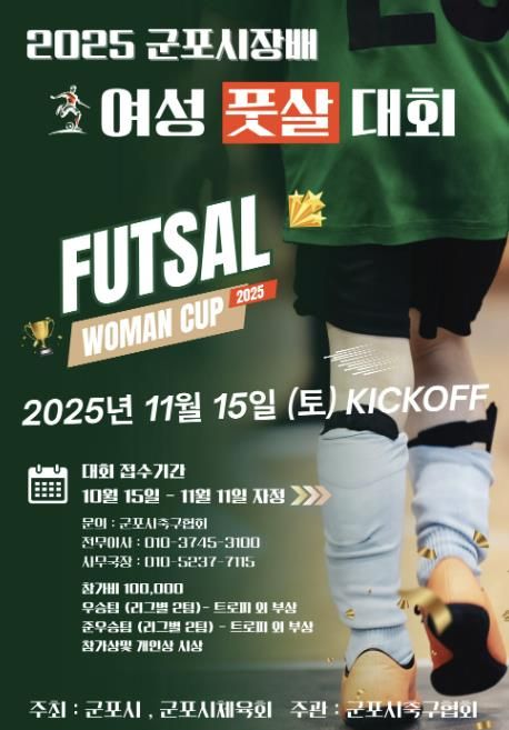 경기호연뉴스 민선기 기자 | 군포시는 여성 생활체육 참여 확대와 건전한 스포츠 문화 확산을 위해 ‘2025 군포시장배 여성 풋살대회’를 오는 11월 15일(토) 군포시 국민체육센터 축구장에서 개최한다.