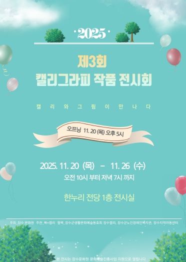 이번 전시는 장수문화원이 주최하고 북n캘리가 주관했으며, 장수군생활문화예술동호회 장수캘리, 장수군노인장애인복지관, 장수지역아동센터가 협력해 진행된다.