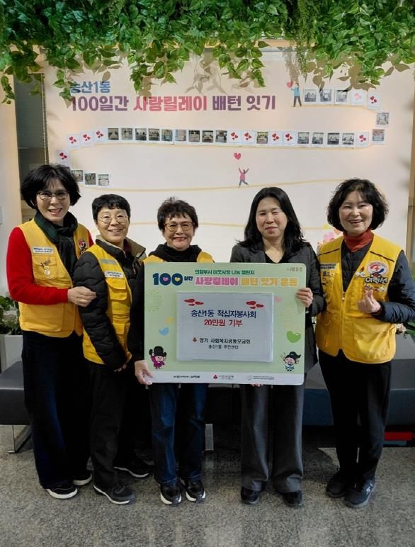 경기호연뉴스 민선기 기자 | 의정부시 송산1동주민센터는 12월 2일 대한적십자사 송산1동적십자봉사회가 ‘100일간 사랑릴레이 배턴 잇기’에 동참해 사랑의 성금 20만 원을 기탁했다고 밝혔다.