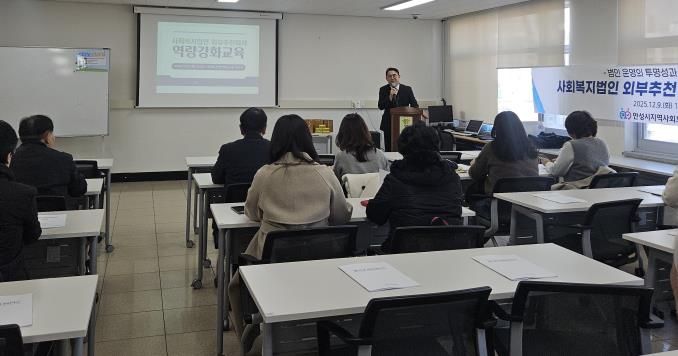 교육은 율목종합사회복지관 이경석 관장이 맡아 사회복지법인의 법적 근거와 외부이사 제도의 취지, 이사회 구성 및 운영의 핵심 원칙, 투명한 회계 관리 및 윤리적 의사결정 등 실무 중심의 강의가 진행됐다.
