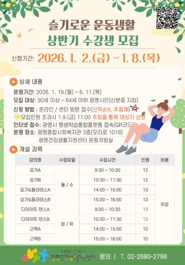 경기호연뉴스 민선기 기자 | 광명시 광명건강생활지원센터는 새해를 맞아 시민들의 건강한 생활습관 형성과 만성질환 예방을 위해 2026년 상반기 ‘슬기로운 운동생활’ 운동 프로그램 참여자를 모집한다.