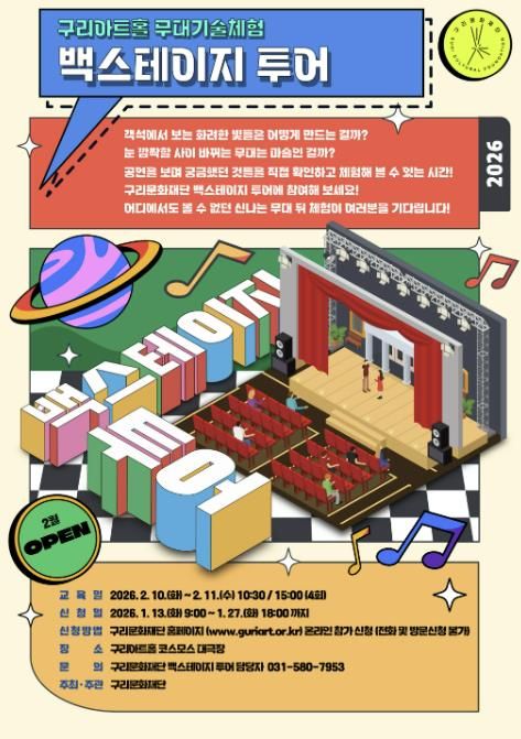 경기호연뉴스 민선기 기자 | 구리문화재단은 〈무대 기술 체험 백스테이지 투어 프로그램〉 참가자를 오는 1월 13일 오전 9시부터 1월 27일 오후 6시까지 재단 홈페이지를 통해 선착순 모집한다고 밝혔다.