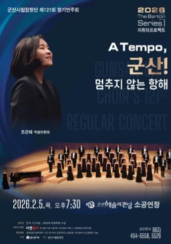 경기호연뉴스 민선기 기자 | 군산시립합창단이 제121회 정기연주회 〈2026 The Barton Series Ⅰ 지휘자 프로젝트〉 A Tempo, 군산! '멈추지 않는 항해'를 오는 2월 5일 저녁 7시 30분, 군산예술의전당 소공연장에서 개최한다.