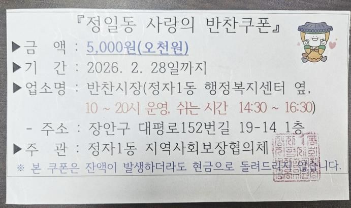 경기호연뉴스 민선기 기자 | 수원시 장안구 정자1동 지역사회보장협의체는 금년부터 관내 취약계층 가구를 대상으로 매월 5가구에 2만원 상당의 반찬쿠폰을 지급하는 사업을 시작한다고 지난 13일 밝혔다.