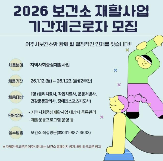 경기호연뉴스 민선기 기자 | 여주시보건소는 지역 내 등록장애인과 예비장애인들의 건강관리를 위한 지역사회중심재활사업 추진을 위해 1월 12일부터 1월 23일까지 2주간 기간제근로자 채용 공고를 실시한다.