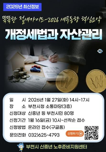 경기호연뉴스 민선기 기자 | 부천시는 1월 27일 시청 3층 소통마당에서 ‘2026년 개정세법과 자산관리’ 재무특강을 진행한다. 이번 특강은 오후 2시부터 5시까지 부천시민 80명을 대상으로 무료로 진행되며, 신중년의 자산관리 역량을 높이고 안정적인 노후설계를 지원하기 위해 마련됐다.