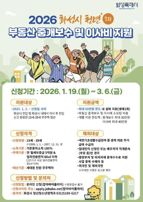 경기호연뉴스 민선기 기자 | 화성특례시가 19일부터 3월 6일까지 청년들의 주거비 부담 경감 및 정주 여건 향상을 위한 ‘2026년 상반기 청년 부동산 중개보수 및 이사비 지원사업’ 신청을 받는다.