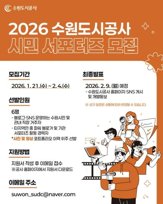 경기호연뉴스 민선기 기자 | 수원도시공사가 21일부터 다음 달 4일까지 2026년도 제8기 시민 서포터즈를 모집한다.