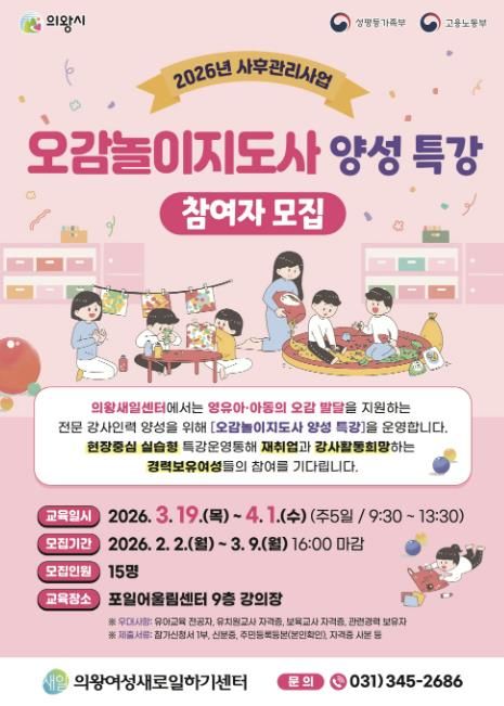 경기호연뉴스 민선기 기자 | 의왕시 여성새로일하기센터가 '오감놀이지도사 양성 특강'의 교육생을 모집한다.