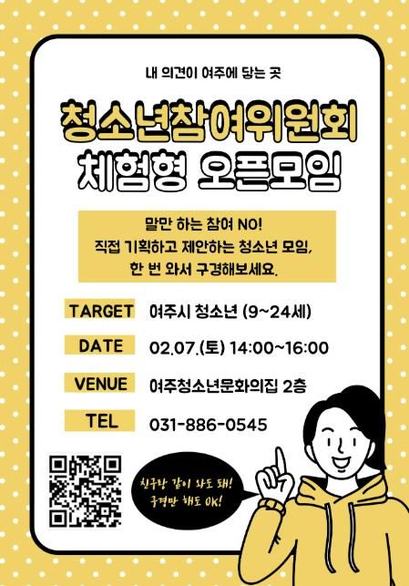 체험형 오픈모임은 2월 7일 오후 2시부터 4시까지 여주청소년문화의집 2층 청소년활동실에서 진행되며, 청참위 정기모임을 참관하고 활동 내용을 살펴볼 수 있다. 참여자는 친구와 함께 방문하거나 구경만 해도 가능하며, 소정의 기념품과 간식도 제공된다.