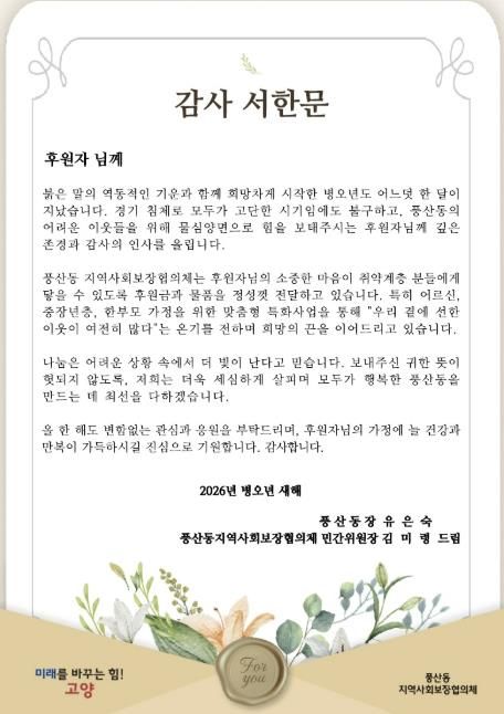경기호연뉴스 민선기 기자 | 고양특례시 일산동구 풍산동 지역사회보장협의체는 설명절을 앞둔 지난 3일 지난해 지역사회의 어려운 이웃을 위해 따뜻한 나눔을 실천한 후원자들에게 감사의 마음을 담은 서한문을 발송했다.