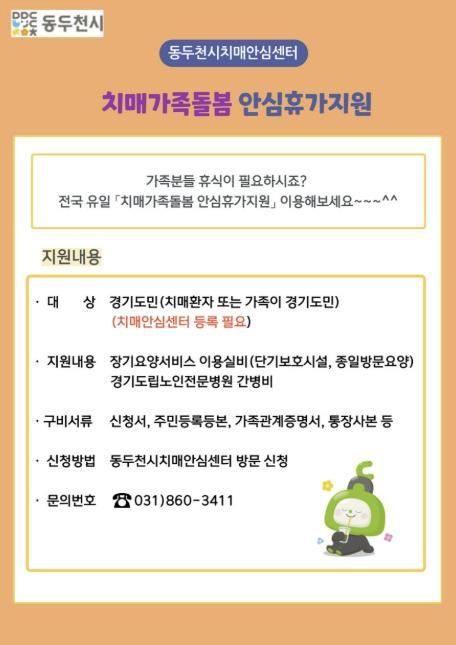 경기호연뉴스 민선기 기자 | 동두천시치매안심센터는 경기도에서 전국 유일로 시행 중인 '치매가족돌봄 안심휴가 지원사업'을 적극 홍보하고, 치매 환자 가족의 돌봄 부담 완화와 휴식 보장을 위해 사업 안내에 나섰다.