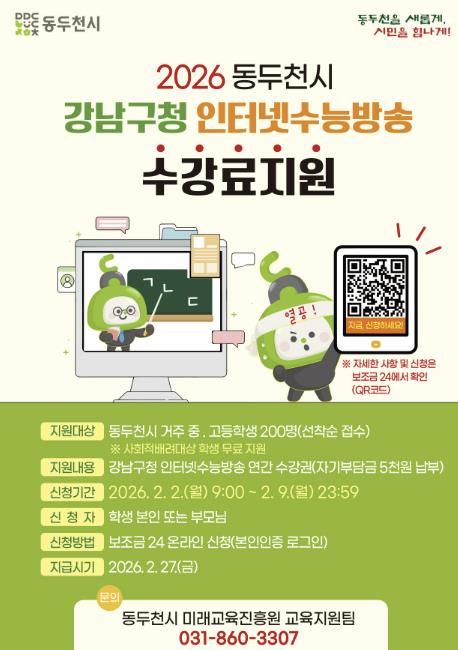 경기호연뉴스 민선기 기자 | 동두천시는 사교육비 부담을 경감하고 교육 격차를 해소하기 위해 관내에 거주하는 중·고등학생을 대상으로 강남구청 인터넷수능방송 연간 수강료 지원 사업을 추진하고 있다.