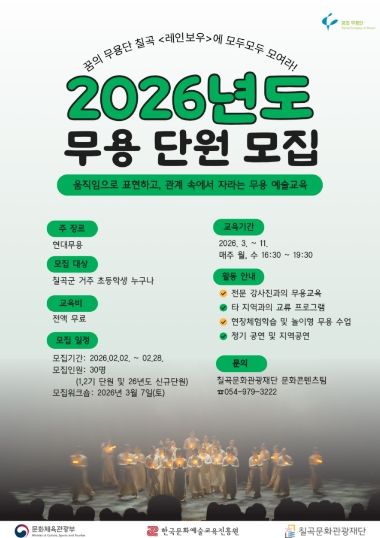 경기호연뉴스 민선기 기자 | (재)칠곡문화관광재단(이사장 김재욱)은 2025 꿈의 무용단, ‘칠곡’ '레인보우' 단원을 모집한다.