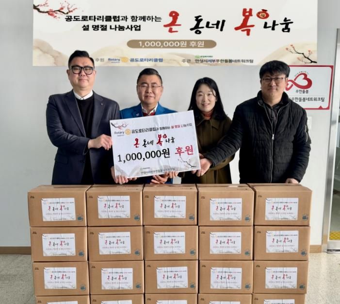 경기호연뉴스 민선기 기자 | 사회복지법인 한길복지재단이 수탁 운영하는 안성시서부무한돌봄네트워크팀은 국제로타리 3600지구 공도로타리클럽과 지난 12일 설 명절 나눔사업 ‘온동네 복나눔’ 후원금 100만 원 전달식을 가졌다.