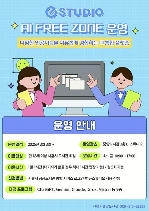 경기호연뉴스 민선기 기자 | 시흥시중앙도서관은 시민들의 인공지능(AI) 활용 역량 강화를 위해 시 정보통신과와 협업해 도서관 3층 e-스튜디오에 ‘인공지능(AI) 프리 존(Free Zone)’을 구축하고, 오는 3월 3일부터 본격 운영에 들어간다.
