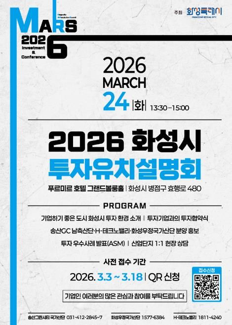 경기호연뉴스 민선기 기자 | 화성특례시가 오는 3월 24일 푸르미르 호텔에서 ‘2026 화성특례시 투자유치 설명회’를 개최하고, 3월 3일부터 3월 18일까지 QR코드를 통한 사전접수를 진행한다.